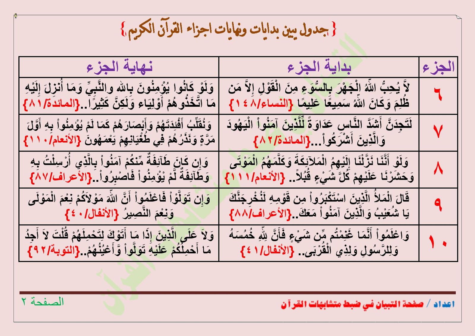 جدول يبين بدايات ونهايات اجزاء القرآن الكريم Pdf