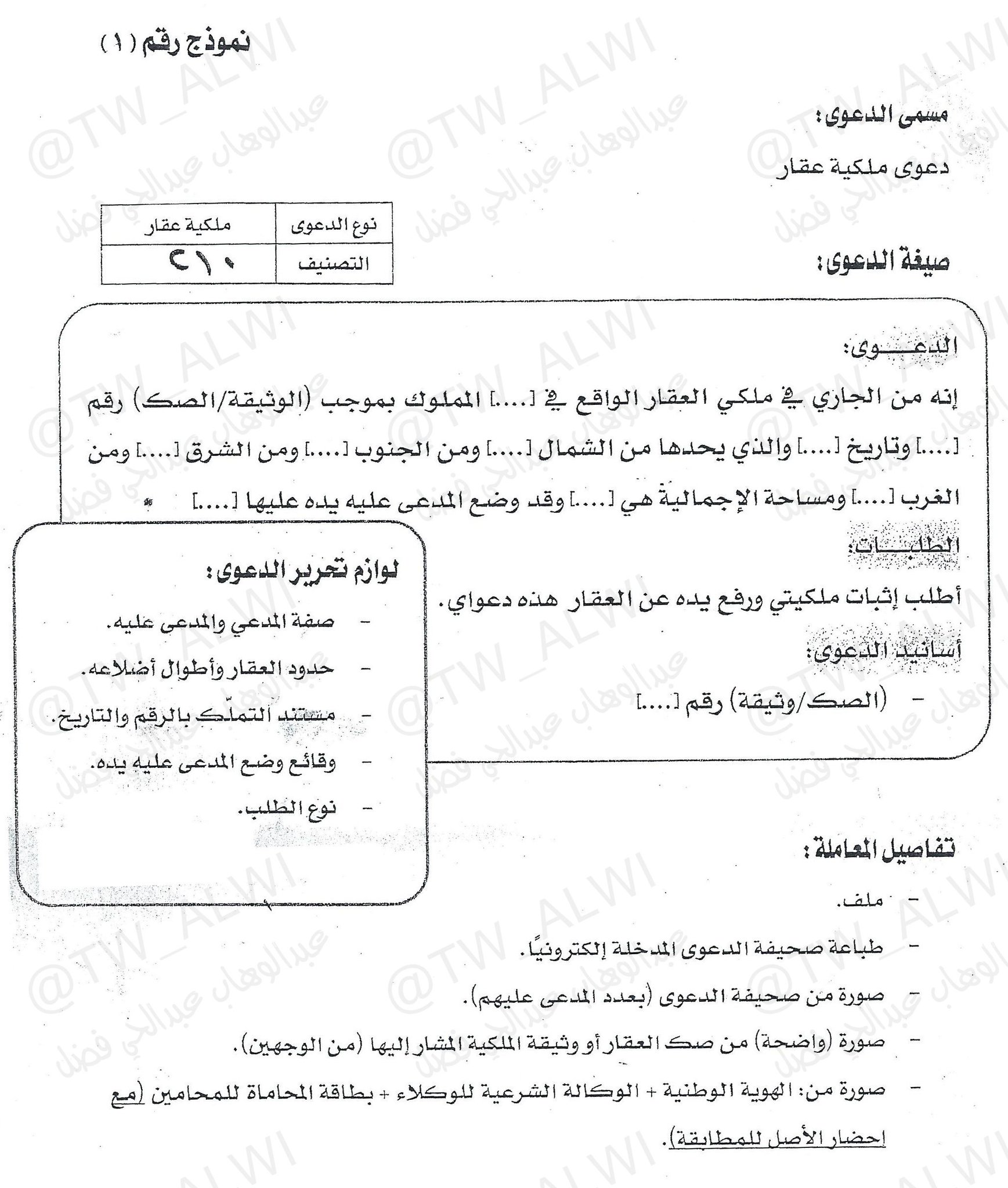 البحوث القانونية عبدالوهاب بن فضل On Twitter مسمى الدعوى ملف متكامل عن صيغة الدعوى يشمل ملكية عقار قيمة مبيع تسليم مبيع أجرة وإخلاء عقار تداخل عقارات مبلغ مالي بيع تقسيط كفيل غارم مرورية مقاولات المالك والمقاول أتعاب محاماة مطالبة بمستندات