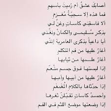 اصابك عشق أم ر ميت بأسهم فما هذه إلا سجي ة مغرم ألا فاسقني كاسات وغن لي بذكر س ل ي مة والكمان ونغ مي أيا داعيا بذكر العامرية أنني أغار عليها من فم المتكل م أغار عليها من ثيابها إذا لبستها فوق جسم منع م ليل.
