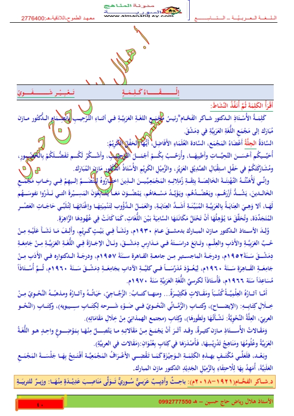 موضوع إلقاء كلمة اللغة العربية الصف التاسع