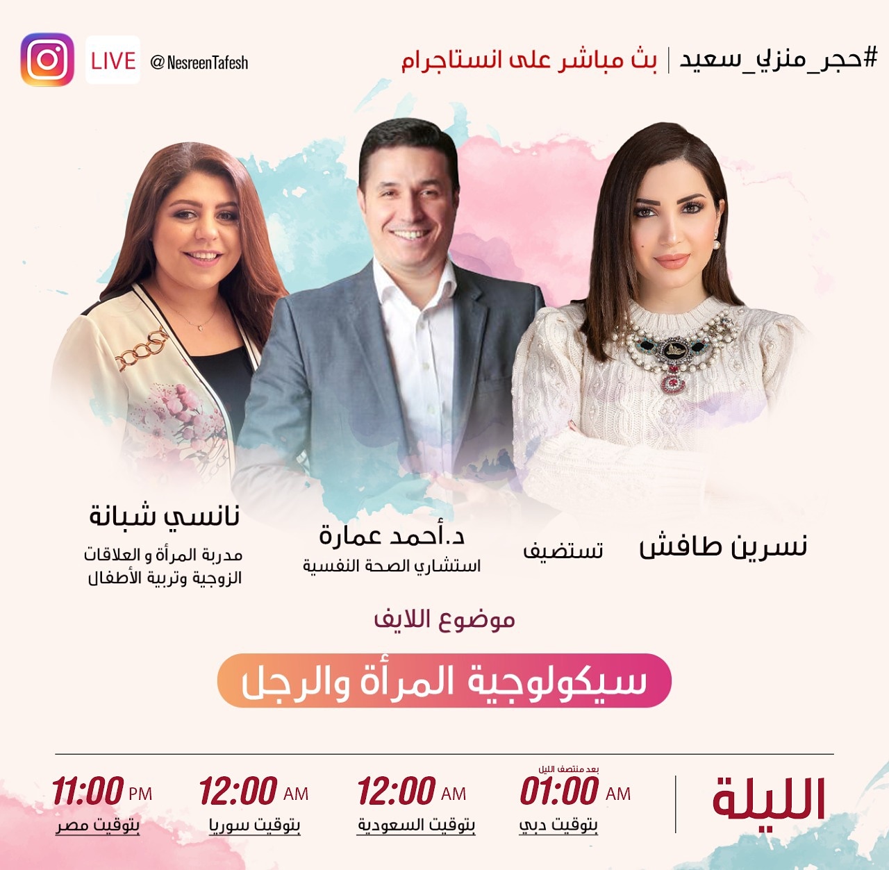 نسرين طافش On Twitter الليلة لايف حجر منزلي سعيد مع الأعزاء دكتور أحمد عمارة استشاري الصحة النفسية و الحبيبة نانسي شبانة مدربة المرأة و العلاقات الزوجية بعنوان سيكولوجية المرأة و الرجل رح نحكي بكل