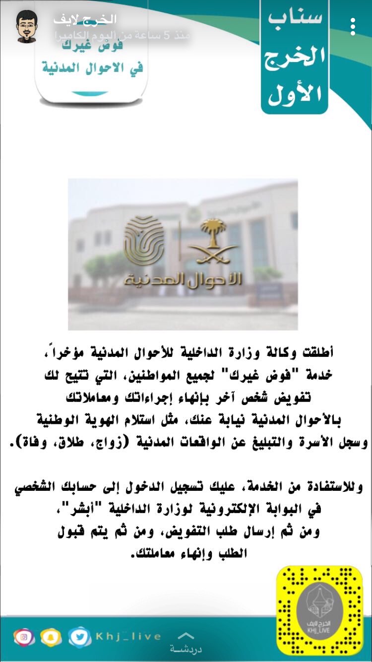 الخرج لايف Auf Twitter فوض غيرك ينهي اجراءاتك لدى الأحوال المدنية خدمة اطلقتها وكالة وزارة الداخلية للأحوال المدنية الخرج سناب الخرج لايف Https T Co 9cr9nxuks4