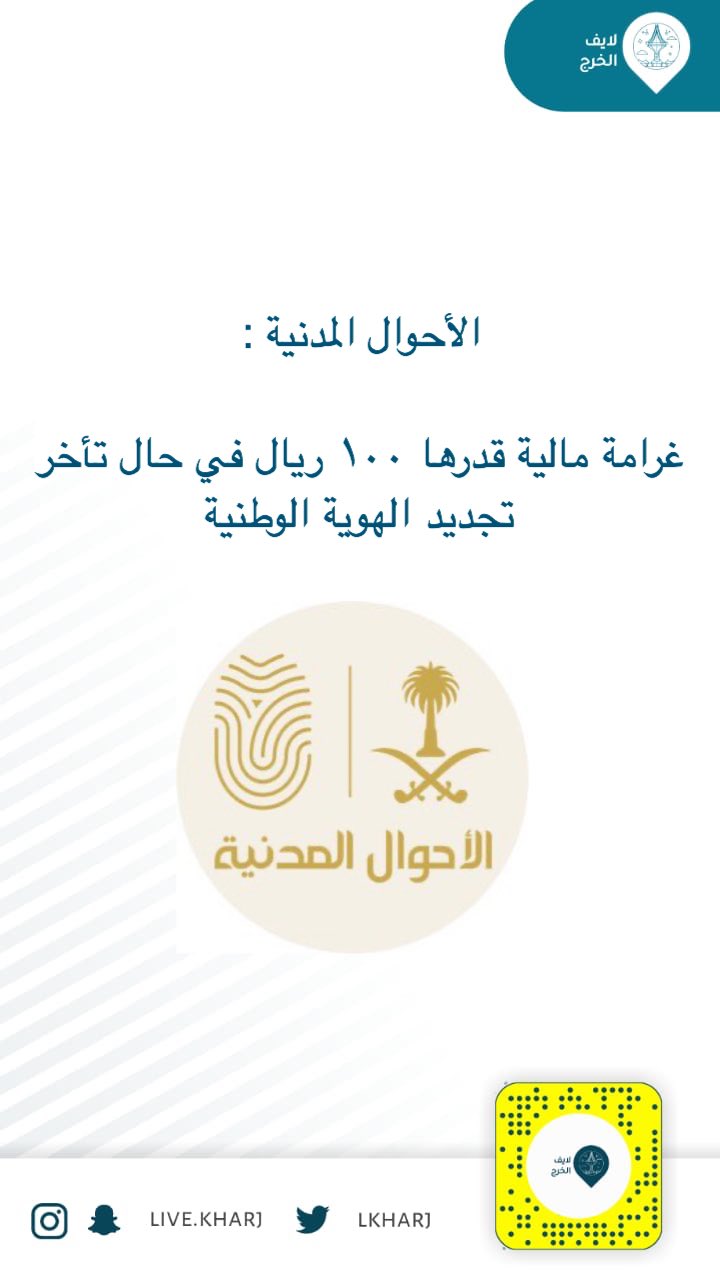 Uzivatel لايف الخرج Na Twitteru الأحوال المدنية غرامة مالية قدرها ١٠٠ ريال في حال تأخر تجديد الهوية الوطنية الخرج