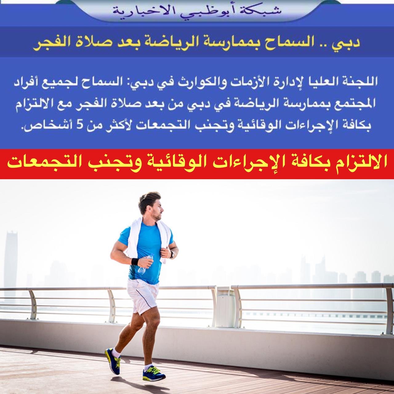 شبكة أبوظبي Pa Twitter اللجنة العليا لإدارة الأزمات والكوارث في دبي السماح لجميع أفراد المجتمع بممارسة الرياضة في دبي من بعد صلاة الفجر مع الالتزام بكافة الإجراءات الوقائية وتجنب التجمعات لأكثر