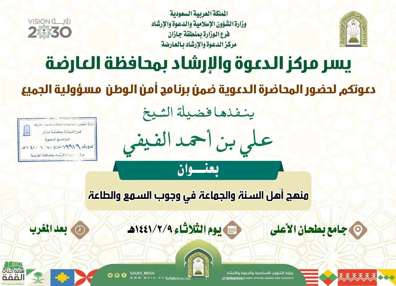 دعوة العارضة Auf Twitter يسر مركز الدعوة والإرشاد بمحافظة العارضة دعوتكم لحضور المحاضرة الدعوية ضمن برنامج أمن الوطن مسؤولية الجميع ينفذها فضيلة الشيخ علي بن أحمد الفيفي بعنوان منهج أهل السنة والجماعة في وجوب