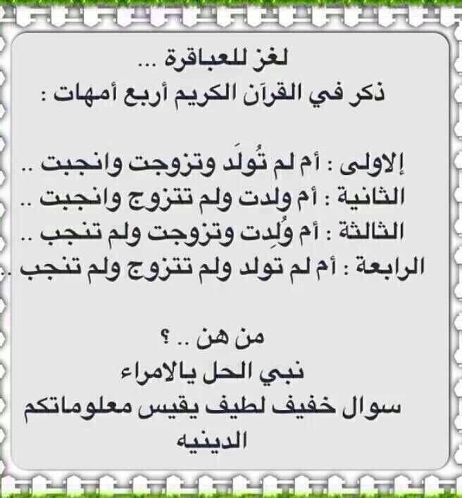 حل لغز يفرمت المخ اربع نساء ذكرن في القرآن الاولى لم تلد وتزوجت وانجبت الثانيه ولدت ولم تتزوج. حل لغز اربع نساء ذكرن في القرآن الاولى لم تلد وتزوجت وانجبت الثانيه ولدت ولم تتزوج وانجبت الثالثه ولدت وتزوجت ولم تنجب الرابعه لم تلد ولم تتزوج ولم تنجب من هن النساء الاربع اجابات الغاز تحدي وذكاء. نسعد بزيارتكم في موقع بـيـت الـعـلـم وبيت كل الراغبين في الحصول علي المعلومات الصحيحة ونود أن نقدم لكم الاجابة النموذجية لسؤال.