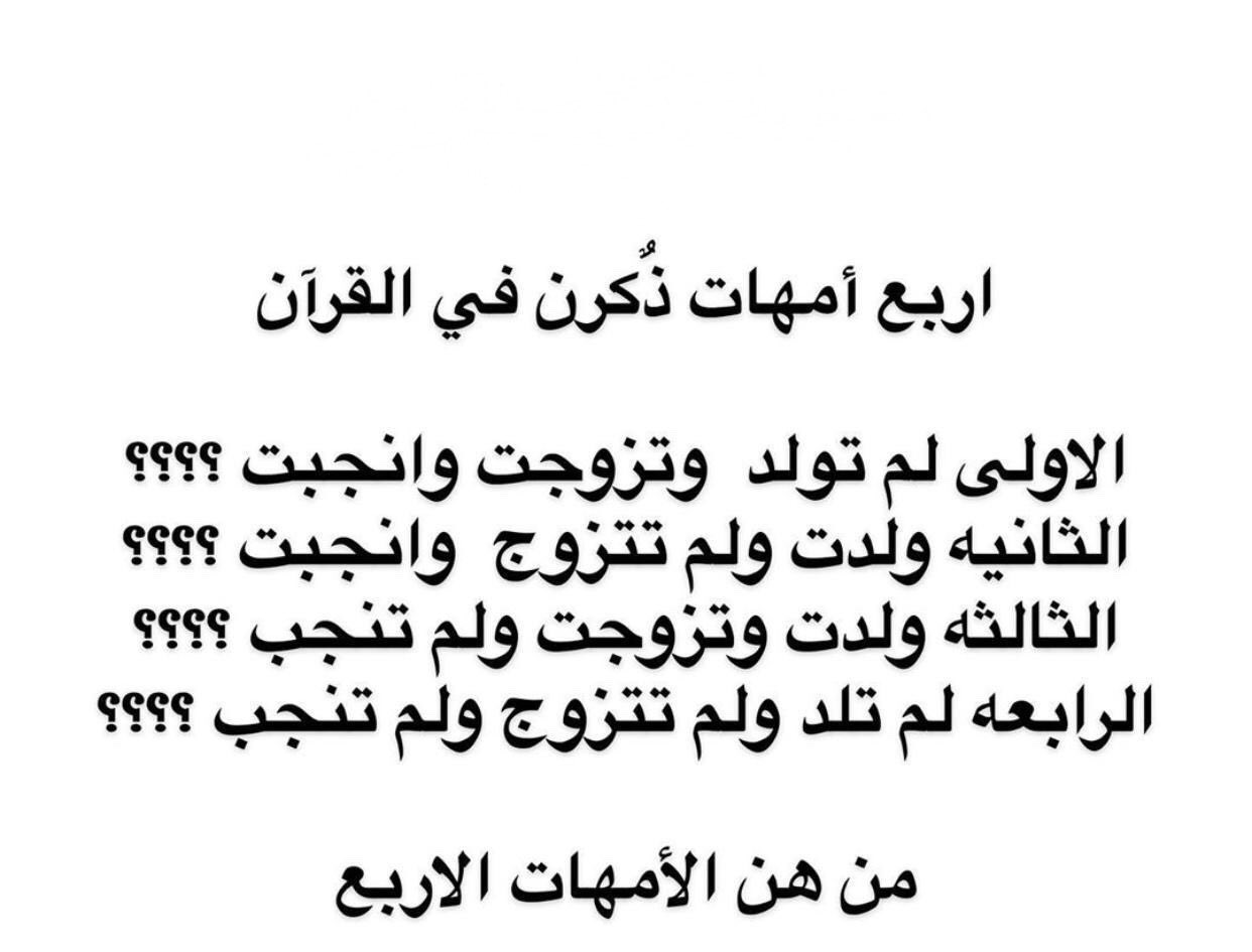 اربع أمهات ذكرن في القران الأولى لم تولد وتزوجت وانجبت. جواب لغز ذكر في القران الكريم اربع امهات الاولى ام لم تولد وتزوجت وانجبت الثانية ام ولدت ولم تتزوج وانجبت. اربع أمهات ذكرن في القران.