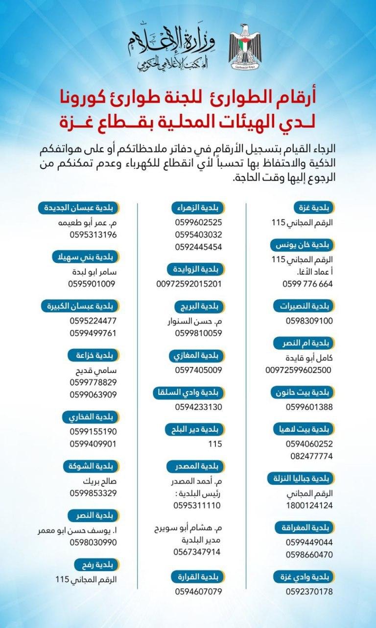 المركز الفلسطيني للإعلام وزارة الإعلام بغزة تعلن عن أرقام الطوارئ للجنة طوارئ كورونا لدى الهيئات المحلية في قطاع غزة كورونا خليك بالبيت غزة