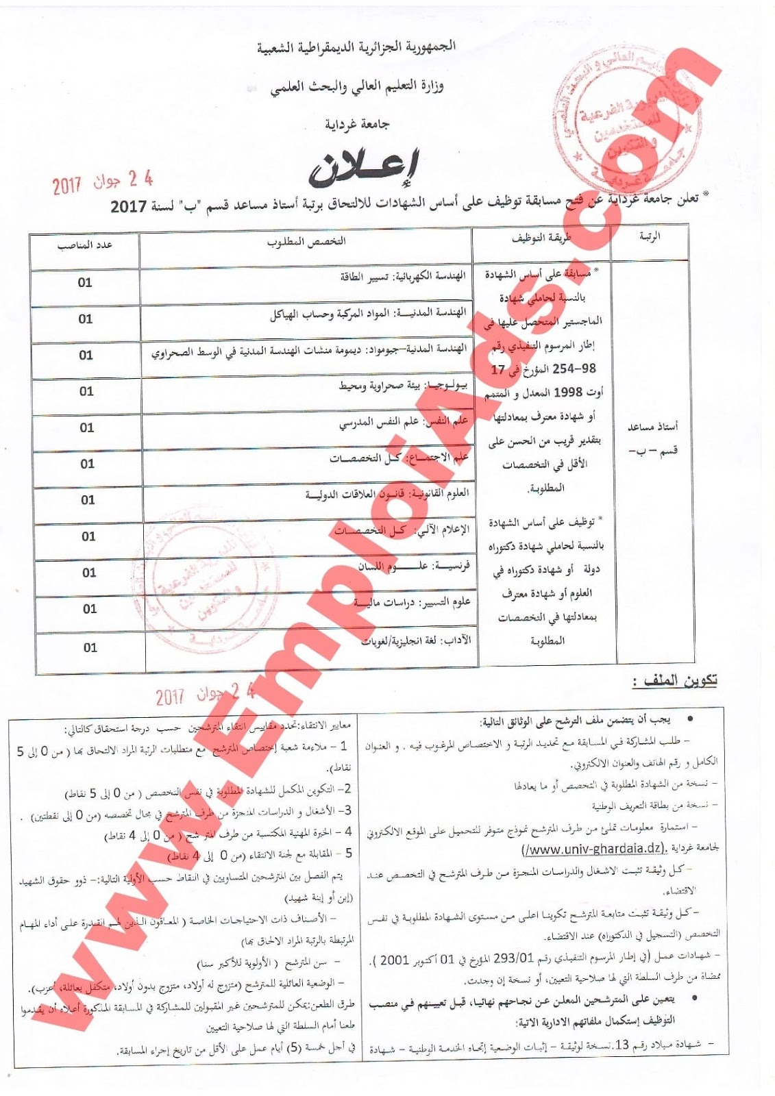 إعلان مسابقة توظيف 11 استاذ مساعد قسم ب بجامعة غرداية جوان 2017