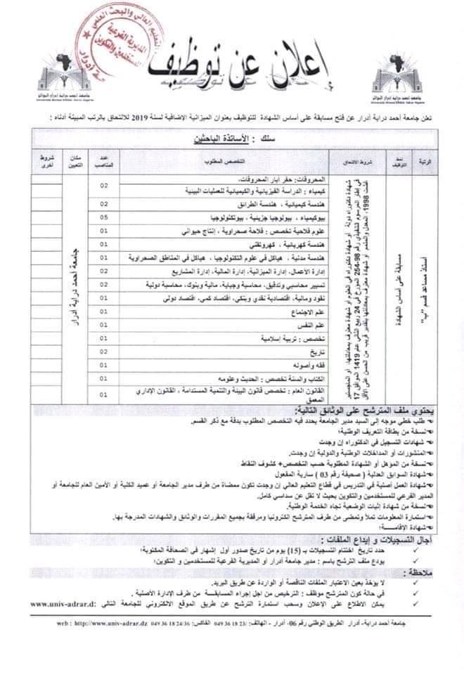 أعلان توظيف أستاذ مساعد قسم ب بجامعة أدرار دورة 2 2019