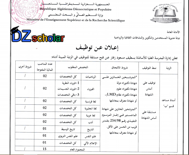 أعلان توظيف أستاذ مساعد قسم ب بالمدرسة العليا للأساتذة مسعود زغار سطيف دورة 2 2019