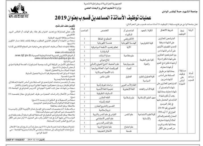 اعلان توظيف أستاذ مساعد قسم ب بجامعة الوادي دورة 2 2019