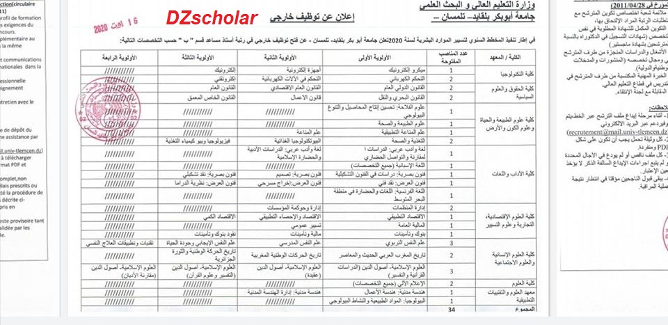 اعلان توظيف أستاذ مساعد قسم ب بجامعة أبوبكر بلقايد تلمسان 2020