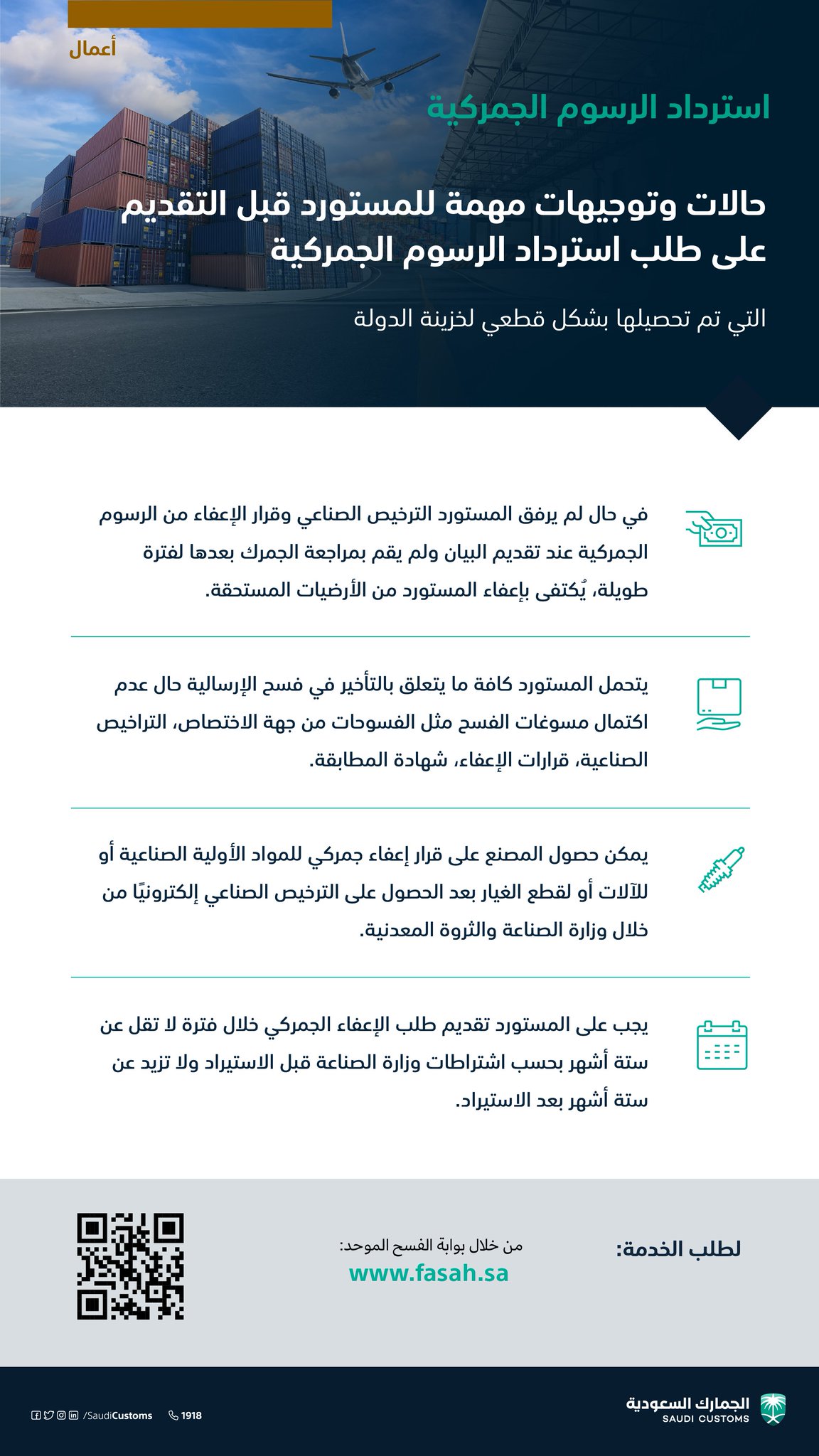 الجمارك السعودية On Twitter تتيح الجمارك السعودية للمستورد إمكانية التقد م بطلب استرداد الرسوم الجمركية التي تم تحصيلها بشكل قطعي في حال استحقاقه وتقديم ما يثبت عبر منصة فسح وفق ا للحالات المذكورة لطلب الخدمة