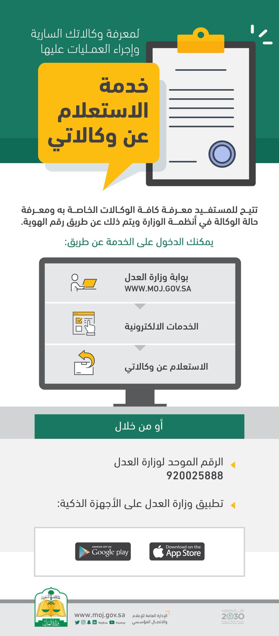يمكن للموطنين التعرف على كافة الوكالات الخاصة بهم من خلال الخدمة التي تقدمها وزارة العدل وهي الاستعلام عن وكالاتي وزارة العدل وذلك عن طريق رقم الهوية.