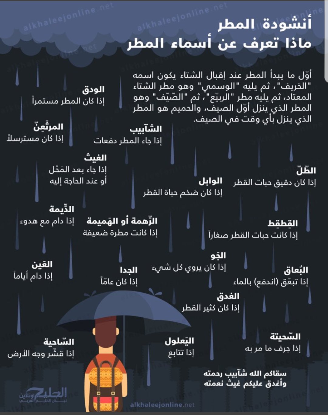 اسماء المطر. أسماء المطر وأوصافه في اللغة العربية ك تب. بحث عن فوائد المطر مكتوب كامل هو بحثنا لهذا اليوم الذي سيشتمل الحديث فيه عن تعريف المطر ومكوناته وأهميته للإنسان والحيوان والنبات وأهميته من الناحية النفسية لدى البعض وكذلك استخدامه كعلاج روحي. وللمطر أسماء أخرى في اللغة العربية ارتبطت التسمية بعدد من.