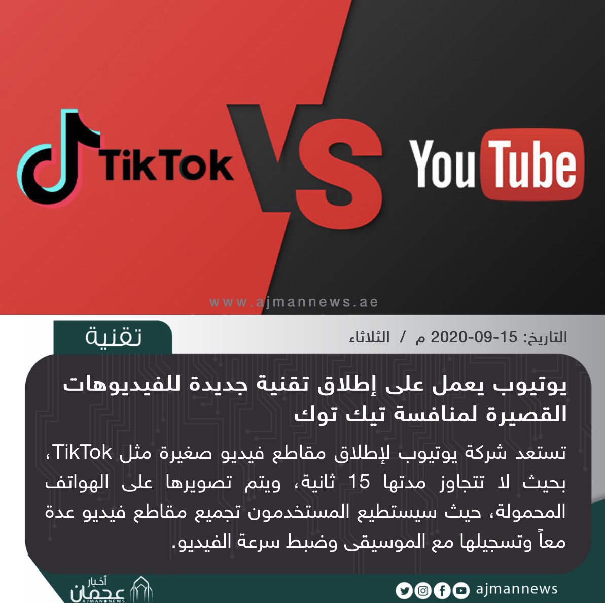 أخبار عجمان يوتيوب يعمل على إطلاق تقنية جديدة للفيديوهات القصيرة لمنافسة تيك توك أخبار تقنية تقنية