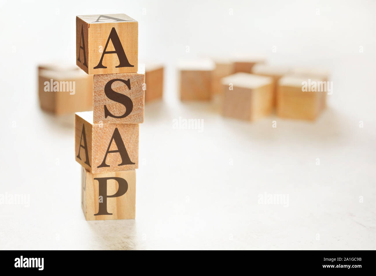 Four Wooden Cubes Arranged In Stack With Text Asap Meaning As Soon As Possible On Them Space For Text Image At Down Right Corner Stock Photo Alamy