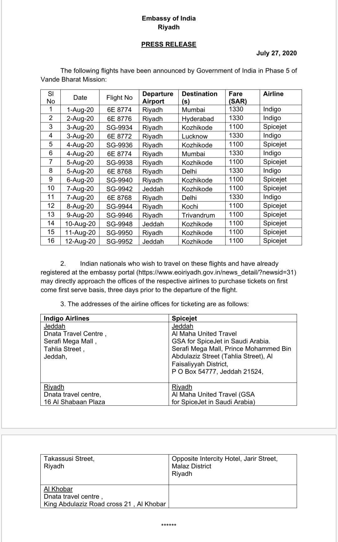 India In Saudiarabia On Twitter Following Flights Have Been Announced In Phase 5 Of Vandebharatmission From Saudi Arabia From 1st August